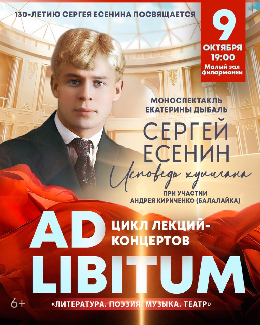 В рамках цикла лекций-концертов «Ad libitum», посвященного синтезу искусств, 9 октября состоится моноспектакль Екатерины Дыбаль «Сергей Есенин. Исповедь хулигана». Мероприятие приурочено к 130-летию со дня рождения одного из самых любимых русских поэтов – Сергея Есенина.