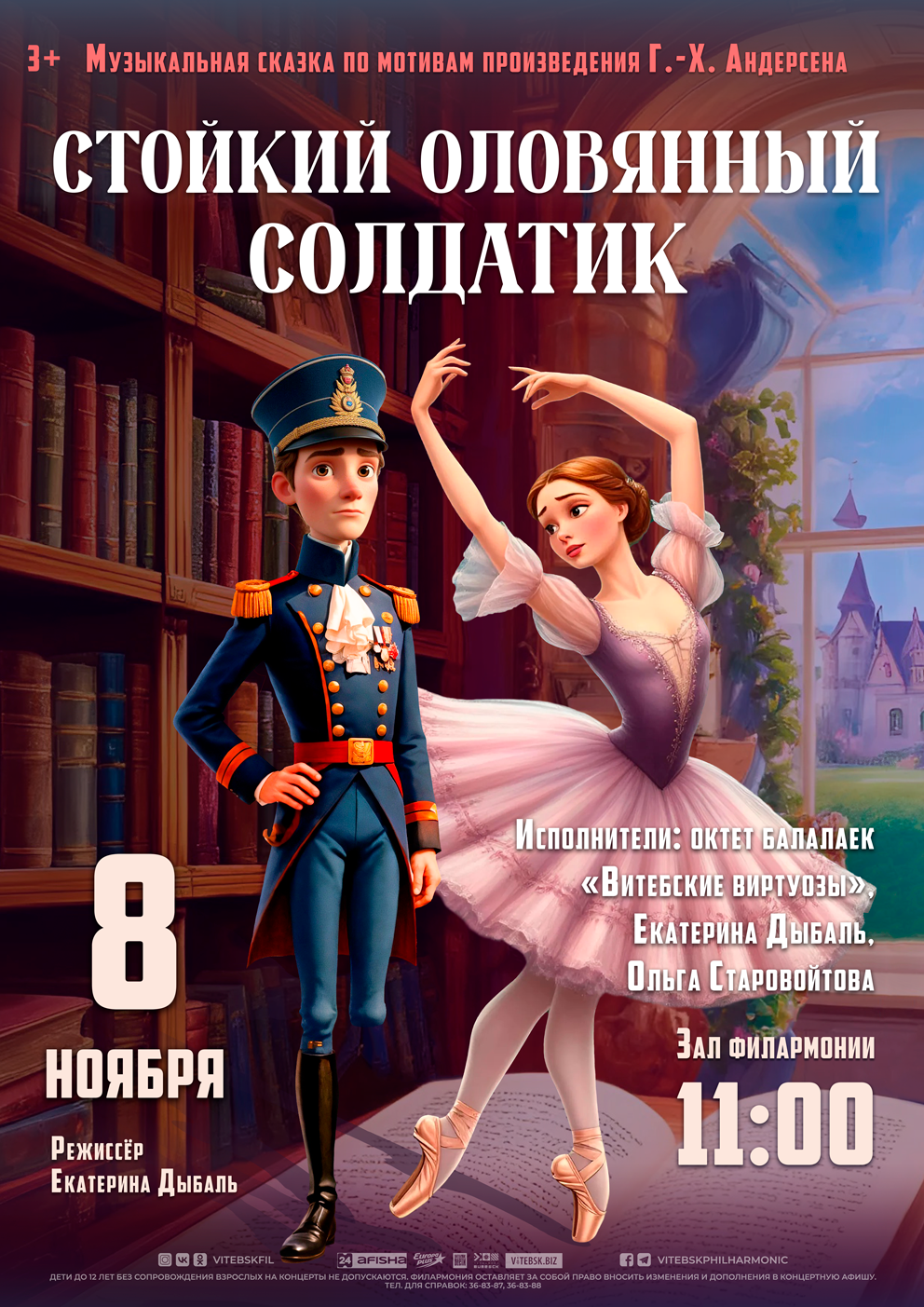 Премьера волшебного музыкального спектакля «Стойкий оловянный солдатик» по мотивам бессмертной сказки Ганса Христиана Андерсена! Этот трогательный спектакль, наполненный музыкой и волшебством, расскажет историю о смелости, верности и настоящей любви.
