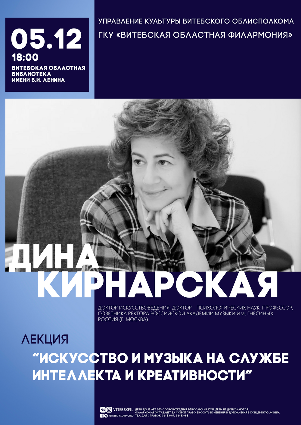В Витебск с эксклюзивной лекцией едет Дина Кирнарская — специалист, объединивший мир искусства и науки – доктор искусствоведения и психологических наук, профессор, советник ректора Российской академии музыки им. Гнесиных. Ее выступления — это всегда событие для искушенной аудитории, а ее курсы по психологии музыкальной деятельности посещают студенты и профессионалы со всего мира!
