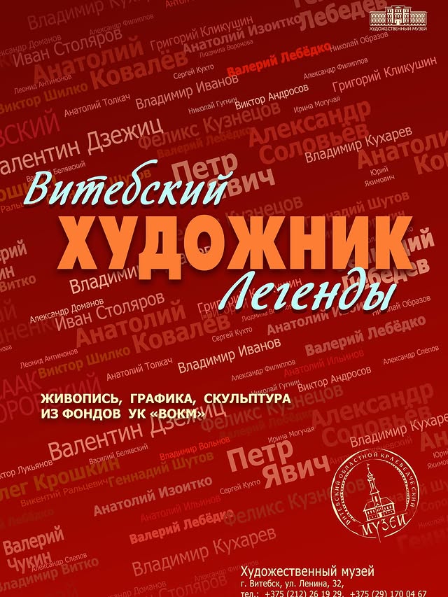 С 6 октября по 30 ноября в Художественном музее проходит выставка «Витебский художник. Легенды», которая является самостоятельной экспозицией ежегодного проекта. В выставочном пространстве представлены работы ушедших художников, которые на проятжениии десятилетий своим творчеством прославляли наш край, предопределяли пути развития изобразительного искусства, в той или иной степени развивали художественные традиции прошлого и закладывали новые, всем укладом своей жизни в искусстве показывали прекрасный пример следующим поколениям. Работы различаются не только по виду искусства и времени исполнения, но и демонстрируют стилевое разноообразие и богатство технических приёмов.