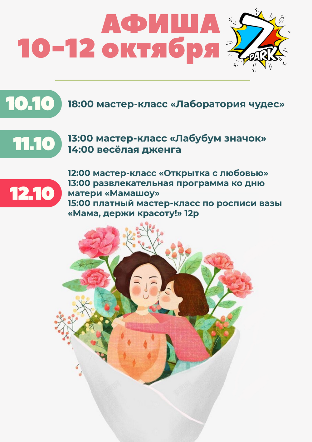 Все мероприятия, за исключением платного мастер-класса в воскресенье, абсолютно бесплатны, вы оплачиваете только входной билет для ребенка в парк. Взрослые в сопровождении проходят бесплатно