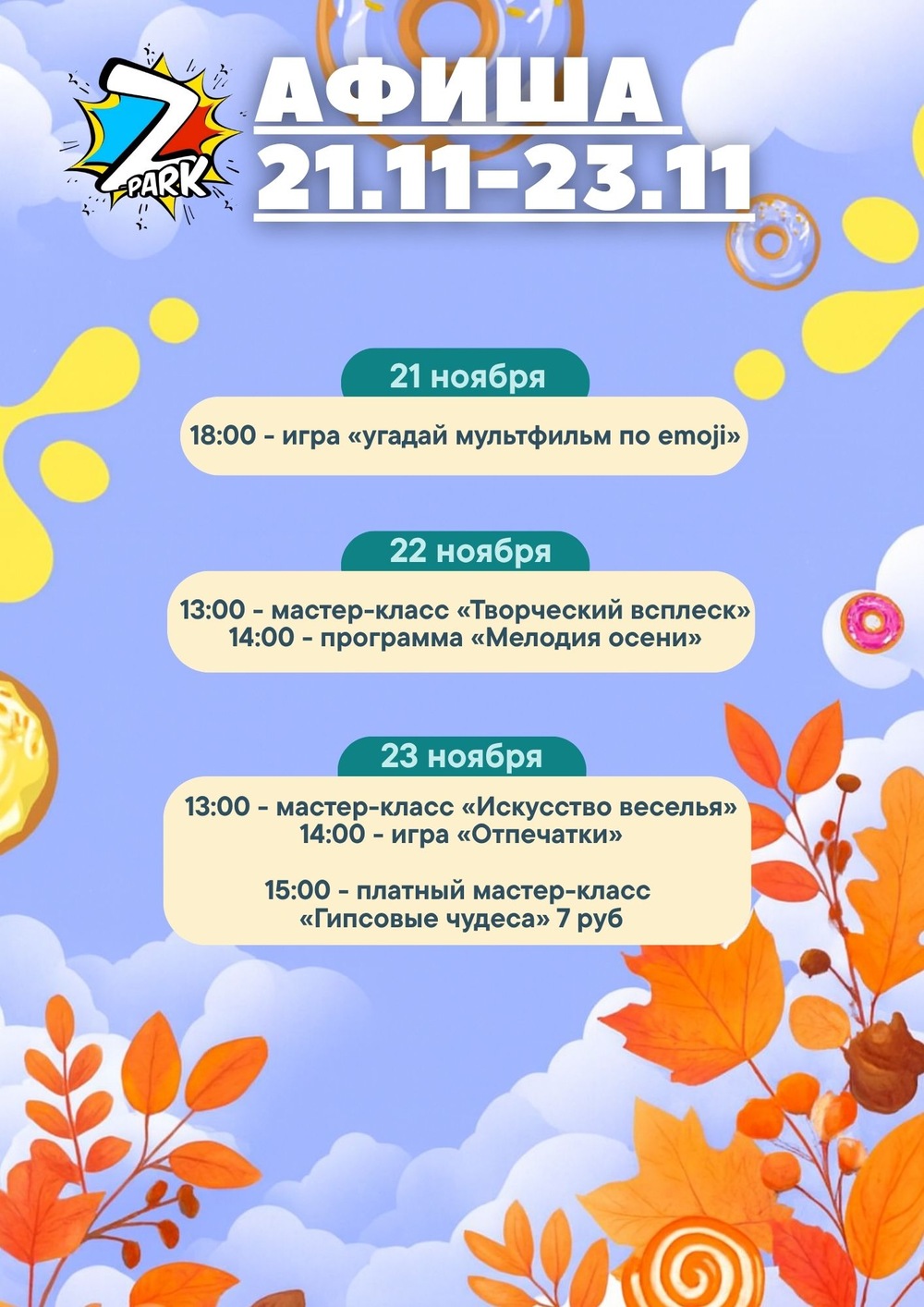 Все мероприятия, за исключением платного мастер-класса в воскресенье, абсолютно бесплатны, вы оплачиваете только входной билет для ребенка в парк. Взрослые в сопровождении проходят бесплатно*