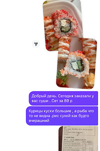 Очень разочарована. Рис как будто вчерашний (сухой)в сетах уже второй раз замечаю рыбы мало добавляют (рис и сыр чувствуется больше).однотипный вкус.разваливаются суши .невкусно (больше заказывать не буду.