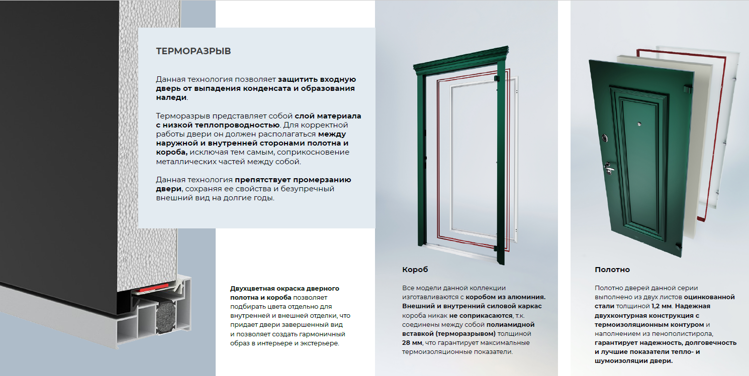 Двери с терморазрывом — новое слово в защите вашего дома от холода и сырости. Конструкция таких моделей включает в себя пробковый лист – природный теплоизолирующий материал. Он помещается между наружной и внутренней частями двери, полностью исключая теплообмен между ними. Таким образом терморазрыв не выпускает тепло из помещения, наружная сторона двери остается холодной, внутренняя теплой. Такие двери идеально подходят для установки в коттедж или другое помещение, имеющее отдельный вход с улицы.