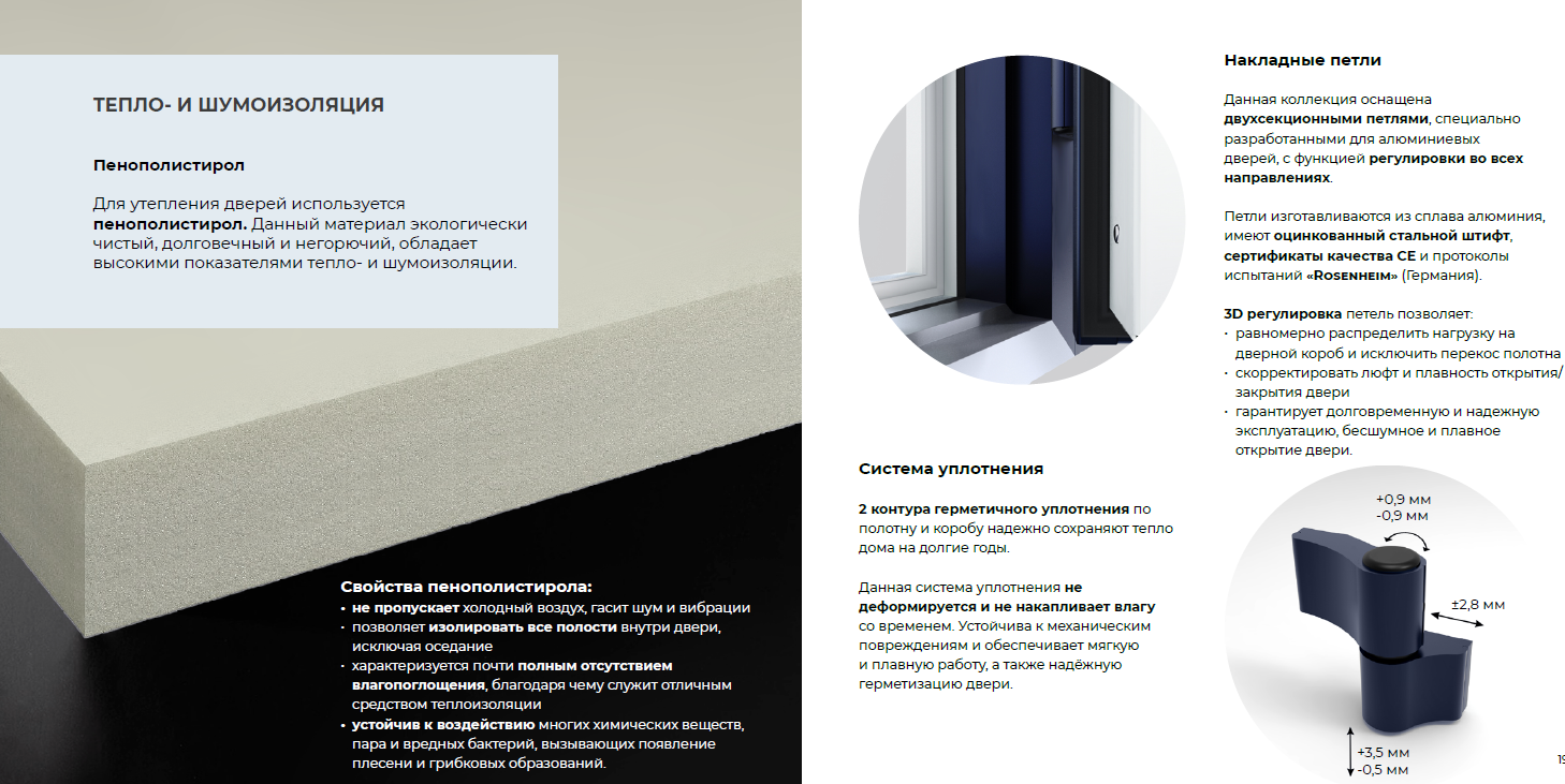 - Накладные петли. Данная коллекция оснащена двухсекционными петлями, специально разработанными для алюминиевых дверей, с функцией регулировки во всех направлениях. Петли изготавливаются из сплава алюминия, имеют оцинкованный стальной штифт, сертификаты качества СЕ и протоколы испытаний «Rosenheim» (Германия). 3D регулировка петель позволяет равномерно распределить нагрузку на дверной короб и исключить перекос полотна, скорректировать люфт и плавность открытия/закрытия двери. Все это гарантирует долговременную и надежную эксплуатацию, бесшумное и плавное открытие двери.