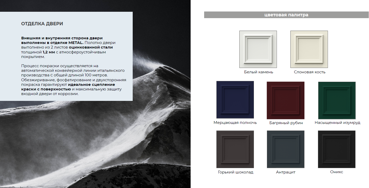- Полотно с терморазрывом. Полотно выполнено из двух листов оцинкованного металла толщиной 1,2 мм. Надежная двухконтурная конструкция с термоизоляционным контуром и наполнением из пенополистирола, гарантирует надежность, долговечность и лучшие показатели тепло- и шумоизоляции двери.