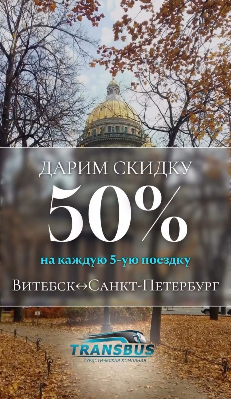 Компания «Транс Бус плюс» предоставляет скидку 50% на каждую 5-ю поездку в Санкт-Петербург из Витебска и обратно.