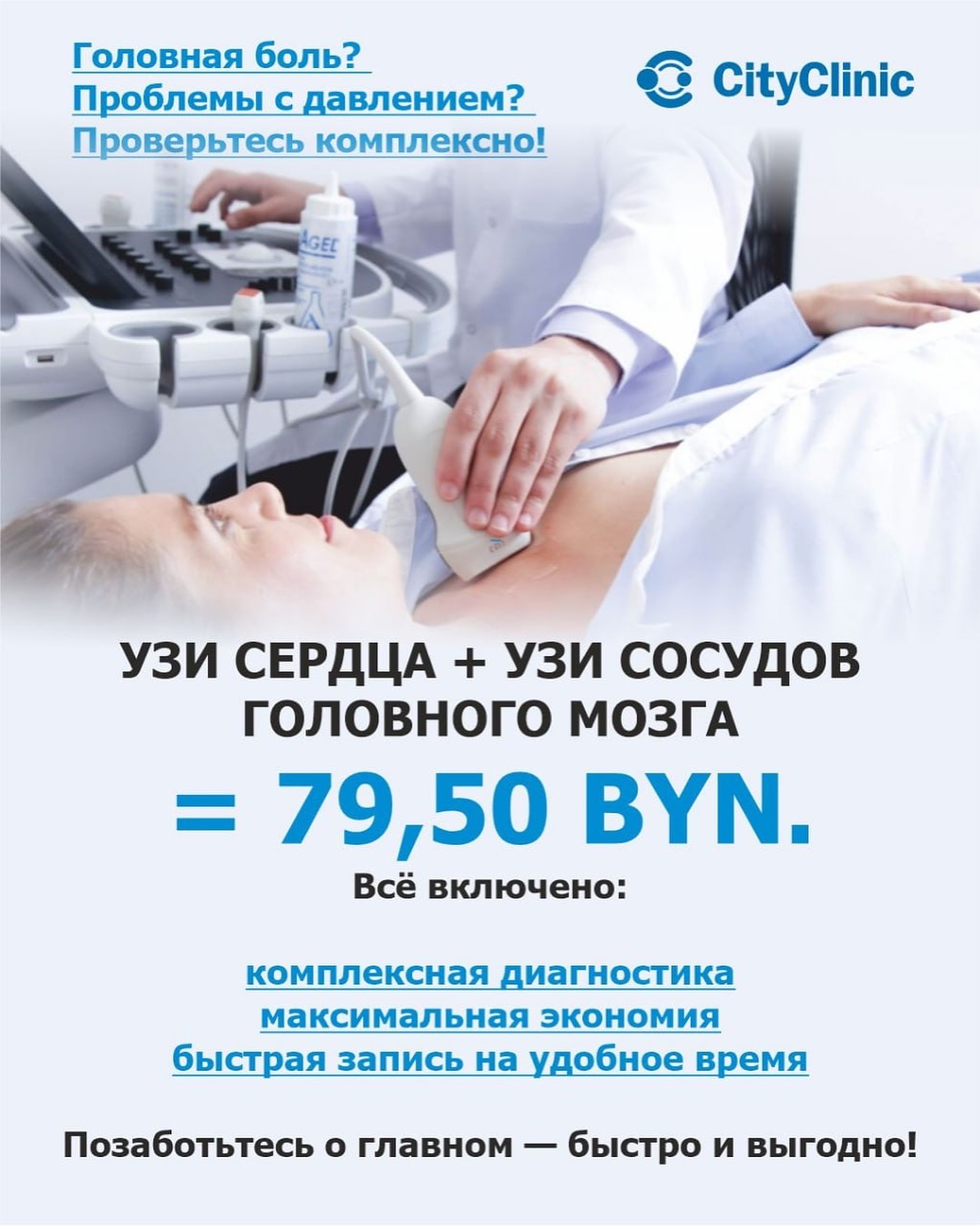 В настоящий момент действует специальная цена на комплексное обследование УЗИ сердца + УЗИ сосудов головного мозга = 79,50 BYN.