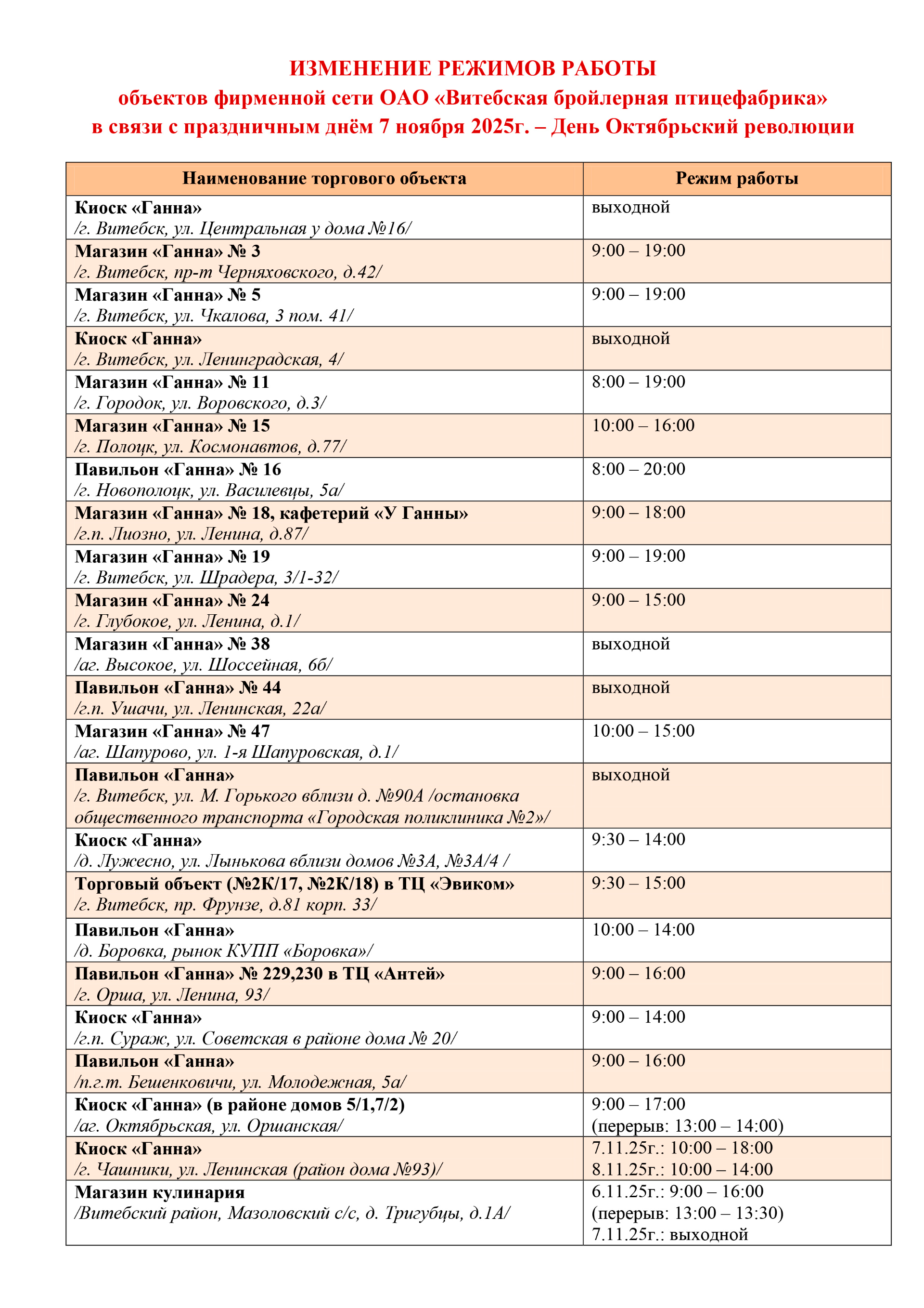Сеть магазинов «Ганна» сообщает актуальный график работы торговых объектов в связи с праздничным днём 7 ноября (День Октябрьской революции).