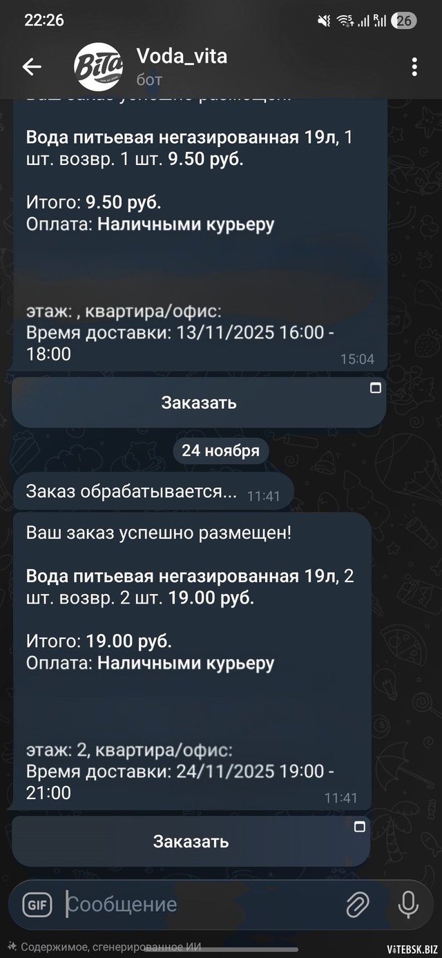 24.11 в 11:41 сделал заказ воды , установил время доставки с19:00 до 21:00 так как знал , что ранее дома никого не будет. Поступил звонок от доставки в 17:59 , как позже выяснилось от доставки , потому что не смог поднять , в 18:04 при следующем звонке , ответил , что буду после 19:00 , где в ответ ни досвидания , ни послал , а просто кинул трубку. Дома был в 18:56 , специально посмотрел , что успел , но по состоянию на 22:34 воду никто так и не привез..... Возникает вопрос о сервисе и для чего тогда выбор времени доставки , никогда его не придерживаются и хотя бы сообщил , что не собирается везти , купил бы в другом месте..... Вы людей за людей не считаете...