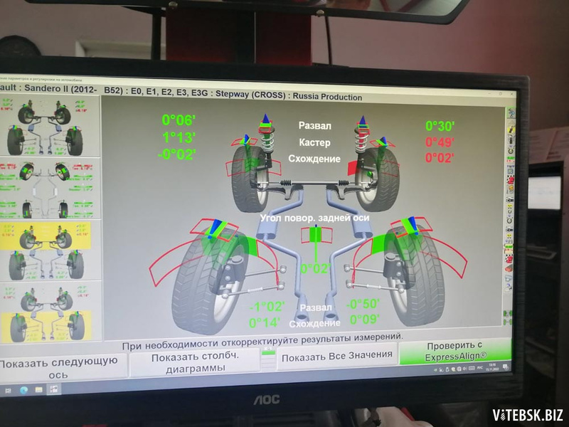 Единственных пару нюансов: минут пять задержали мой въезд (предыдущий клиент не мог на своей новенькой только что купленной тойоте гибриде включить заднюю передачу и выехать из бокса) и не работал принтер, чтобы распечатать результаты схода-развала (но я сфоткала с экрана).
