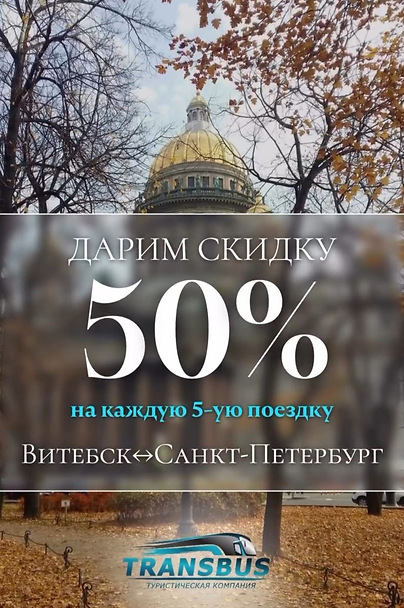 На каждую 5-ю поездку по маршруту Витебск→ Санкт-Петербург предоставляется скидка 50%.