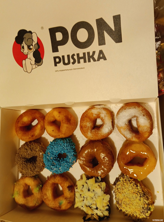 Давно работает эта пончиковая, много наслышана о ней только положительных отзывов, но ещё сама ни разу не была в этом месте и ничего не пробовала. И вот решила исправить эту ситуацию, и приобрела в этой пончиковой бокс "Пробный" за 17.99 рублей. Заранее на сайте просмотрела весь ассортимент пончиков и боксов, чтобы определиться с выбором. Кстати, на сайте сразу указано, что внешний вид пончиков в боксе может отличаться от фотографии на самом сайте, в принципе эта информация очень полезна, так как могут возникнуть некоторые вопросы, когда берешь бокс с пончиками не для себя. В итоге, бокс с пончиками выше всех похвал!!! Пончики очень вкусные и сытные, начинки интересные. Сразу наметила какие начинки пончиков из всех больше понравились. Боксы можно приобрести сразу в пончиковой, а также есть предзаказ на сайте. У меня первое впечатление о пончиковой "Pon - Pushka" только положительное...